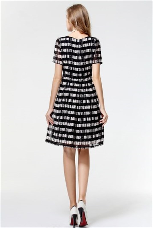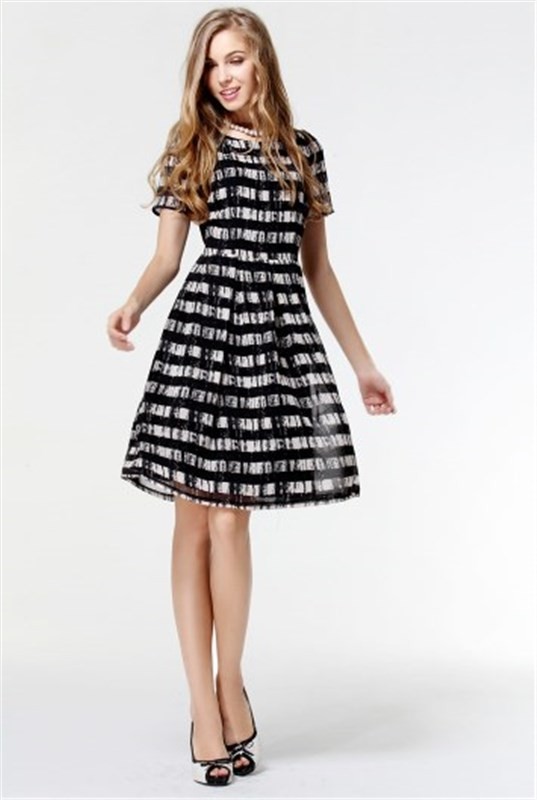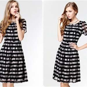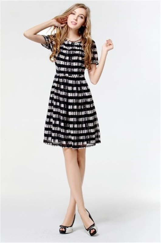 ワンピース パーティー 春 夏 お呼ばれ 二次会 袖付き Aライン ボーダー 膝丈 通勤 オフィス OL きれいめ 20代 30代 40代 50代 大きいサイズ