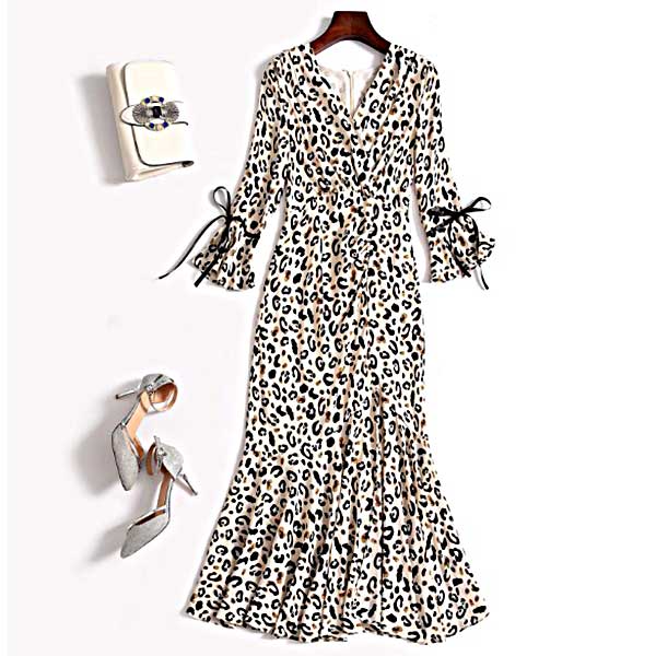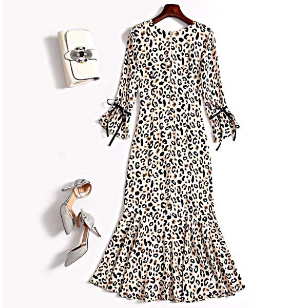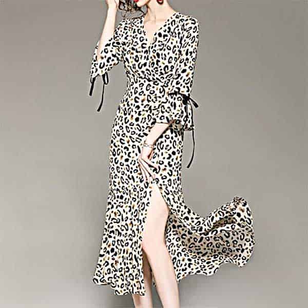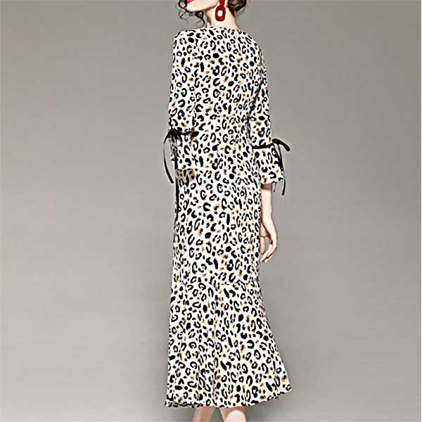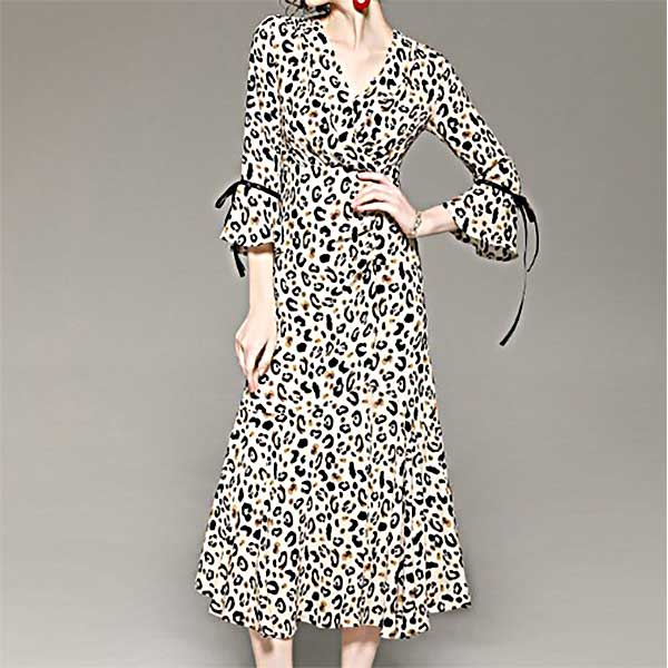 ワンピース マーメイド カシュクール ロング丈 レオパード アニマル ヒョウ柄 シフォン ベージュ系 ブラウン系