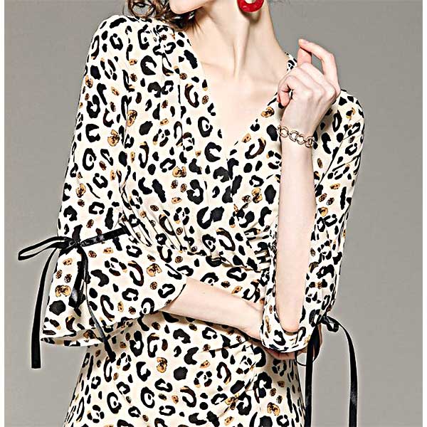 上品なレオパード柄のシフォンワンピース。フレアスリーブとマーメイドラインのスカートがフェミニンです。 ・サイズ(単位cm):肩幅/バスト/ウエスト/袖丈/着丈・S:37/80/68/45/123 ・M:38/84/72/46/124 ・L:39/88/76/47/125 ・2L:40/92/80/48/126 ・3L:41/96/84/49/127