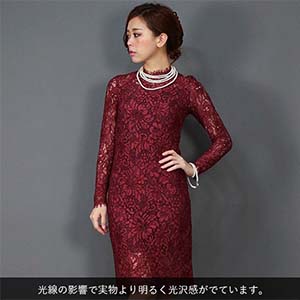 ハイネック ボルドー 総レース 長袖のタイトワンピース{Y-W90]
