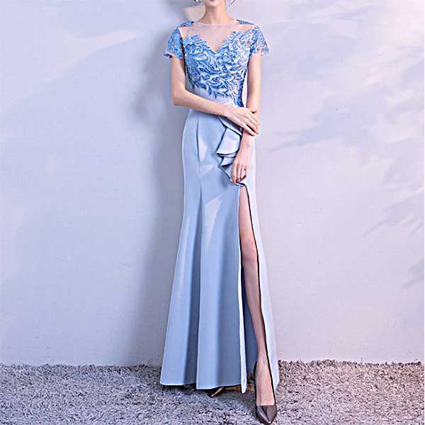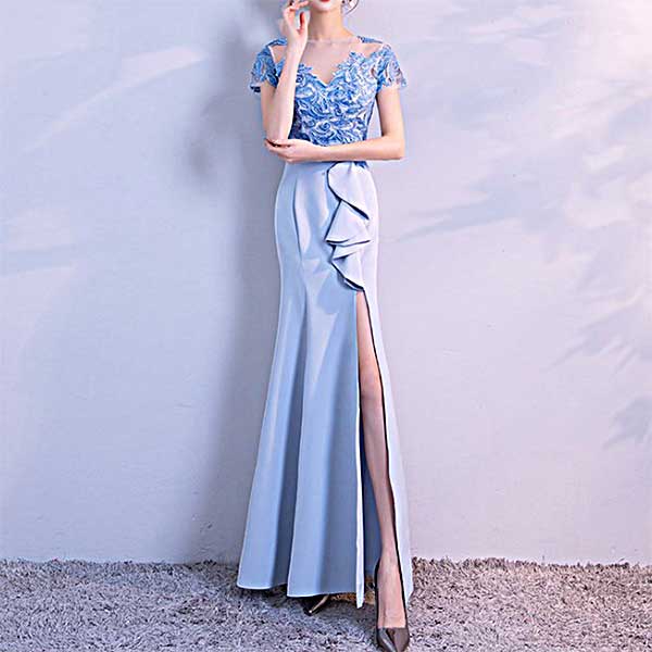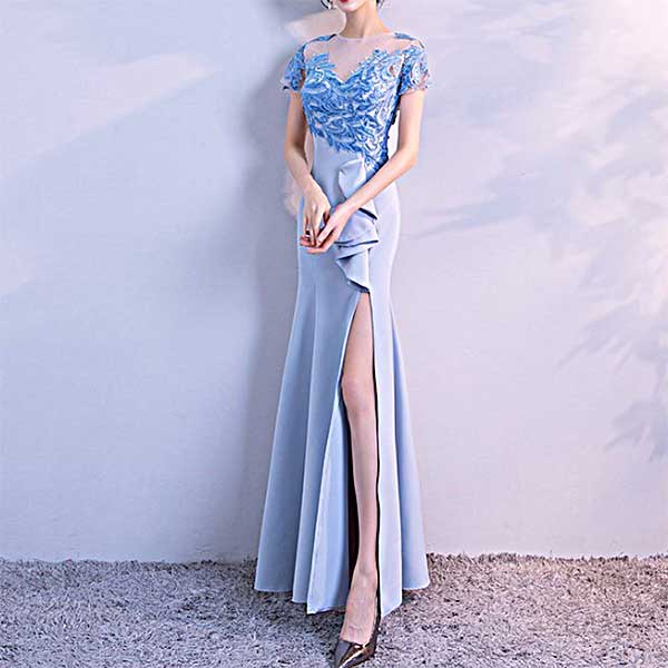 ブルーの大胆 前スリットのロングドレス[DRA29]