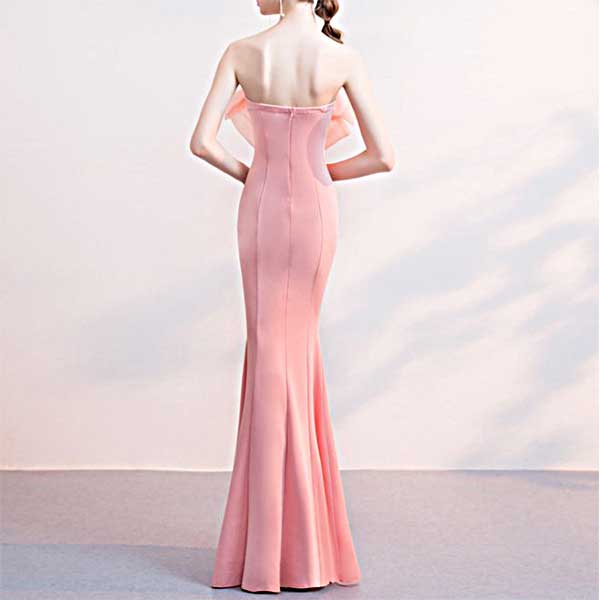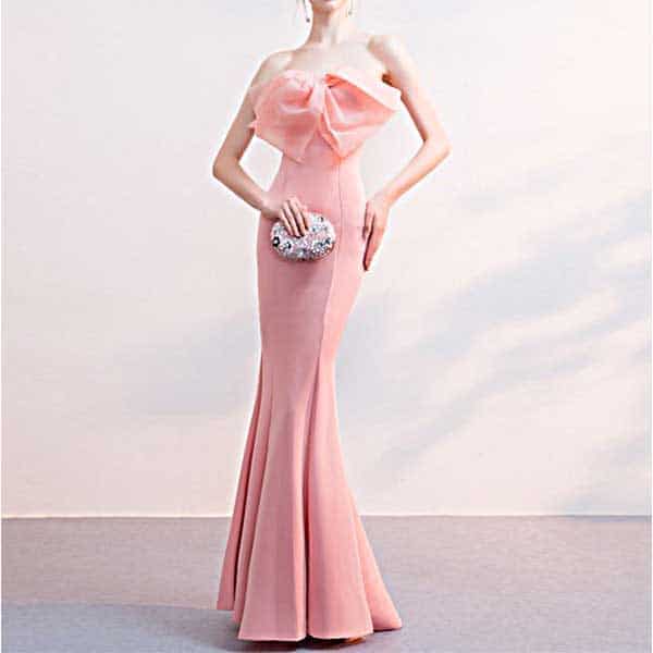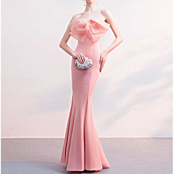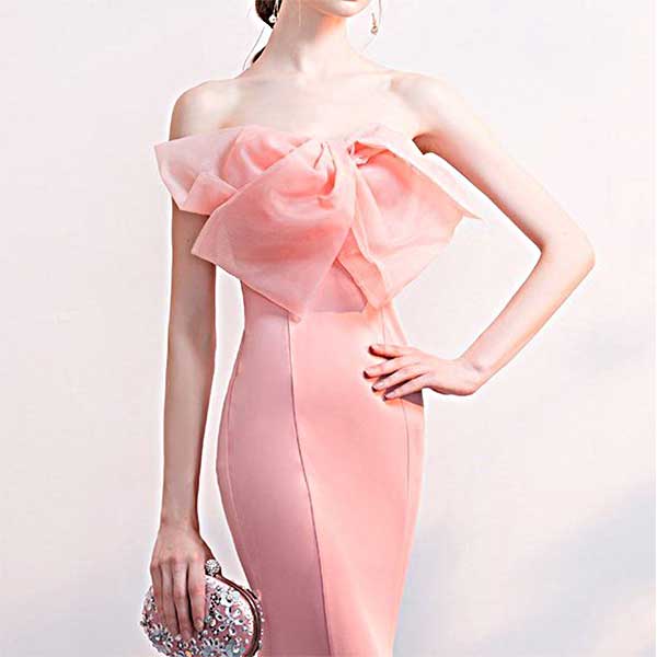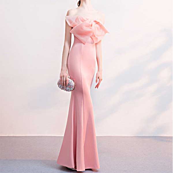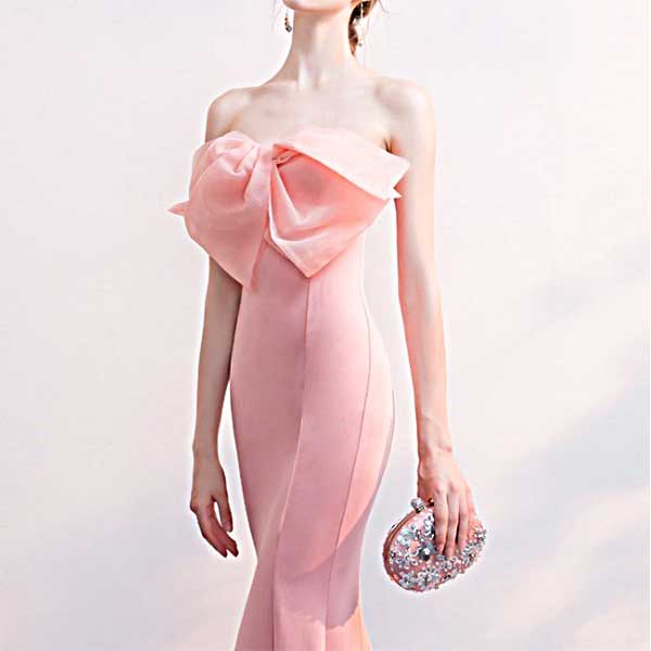大きなリボンが印象的 ピンクのシンプルなイブニングドレス[DRA32]