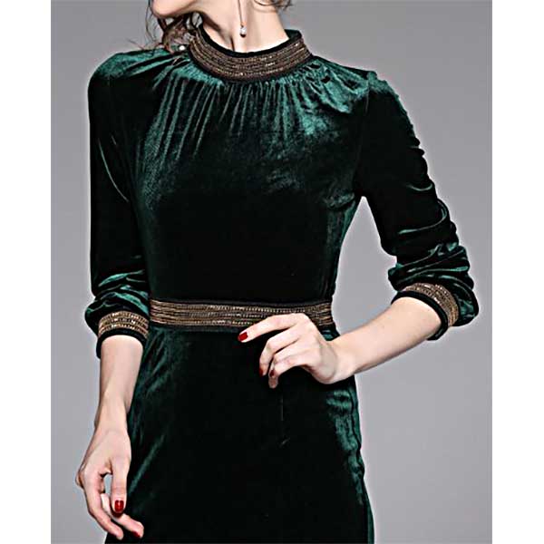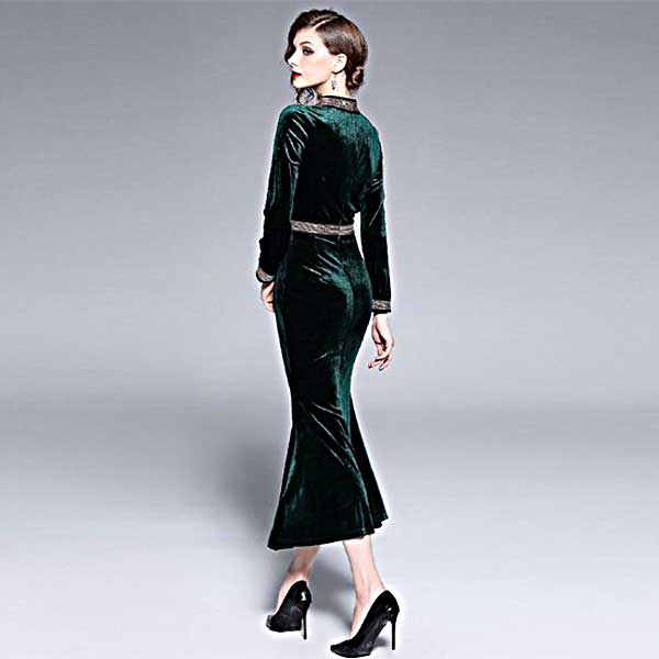 スタンドカラーが今年らしい、ベロアのタイトワンピース。マーメイドラインのシルエットがスタイルアップ効果もある一着です。パーティー、クリスマス、お呼ばれ、演奏会、授賞式などお勧めです。カラー:グリーン