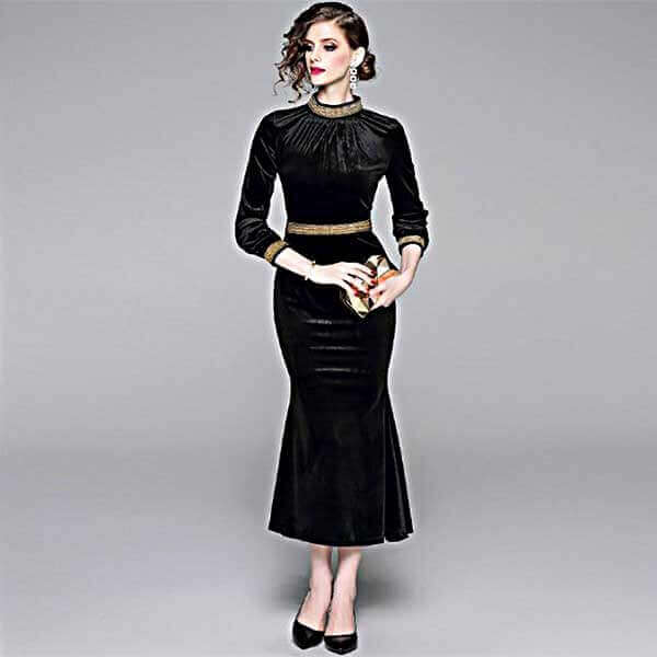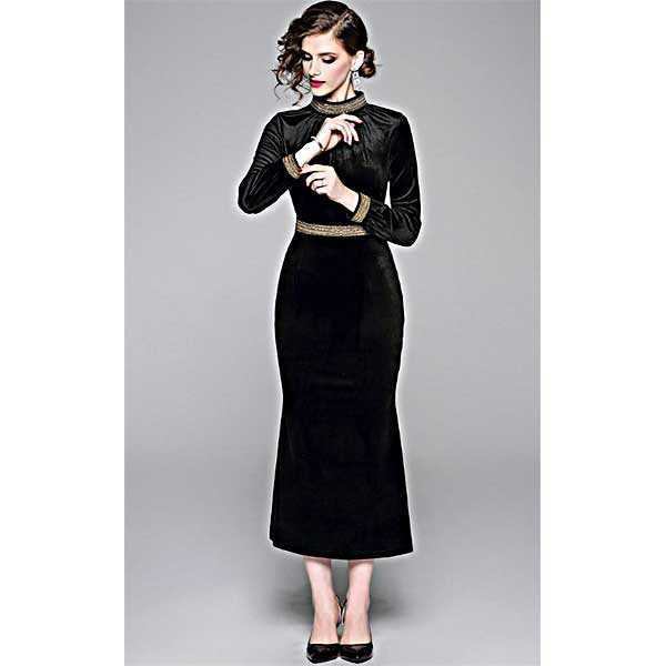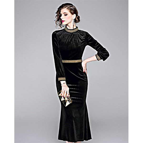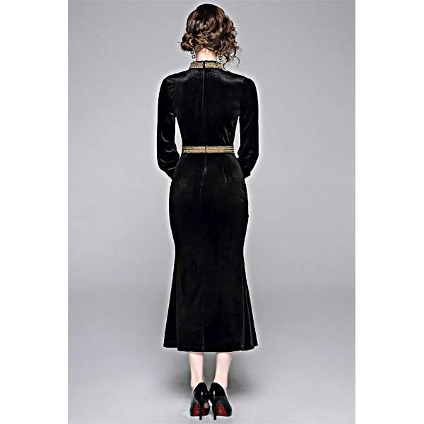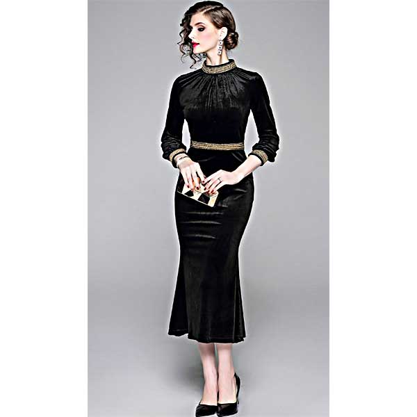 スタンドカラーが今年らしい、ベロアのタイトワンピース。マーメイドラインのシルエットがスタイルアップ効果もある一着です。パーティー、クリスマス、お呼ばれ、演奏会、授賞式などお勧めです。カラー:ブラック