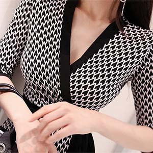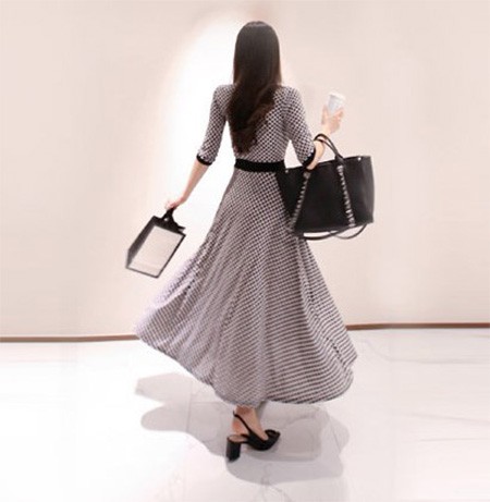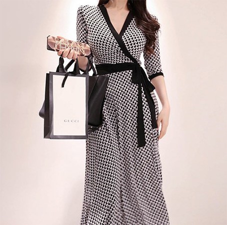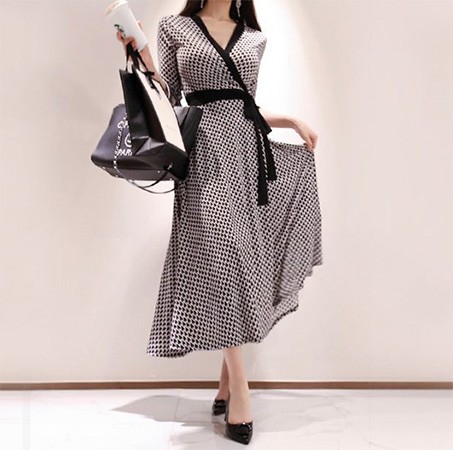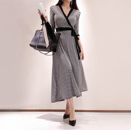 通勤 お仕事 ドレス ワンピース パーティー 袖付き お呼ばれ モノトーン 白黒 カシュクール リボン結び ミモレ丈 ファッション