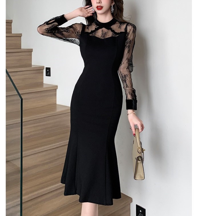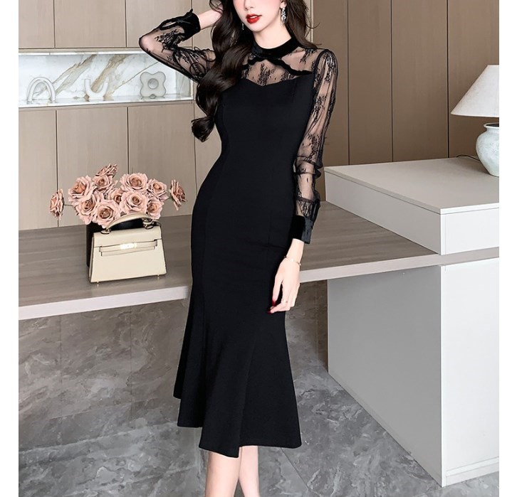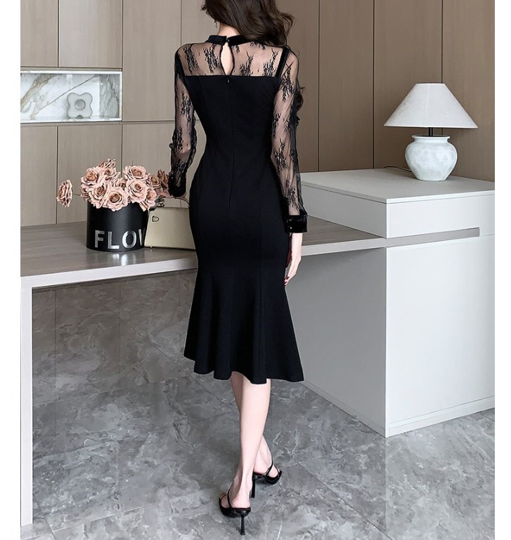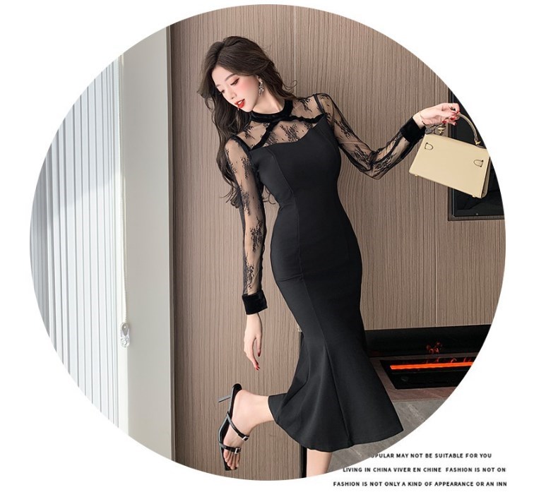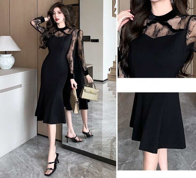レースの長袖 襟元が可愛いブラックドレス[OH35]