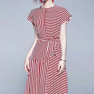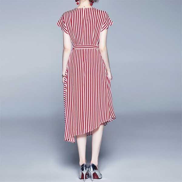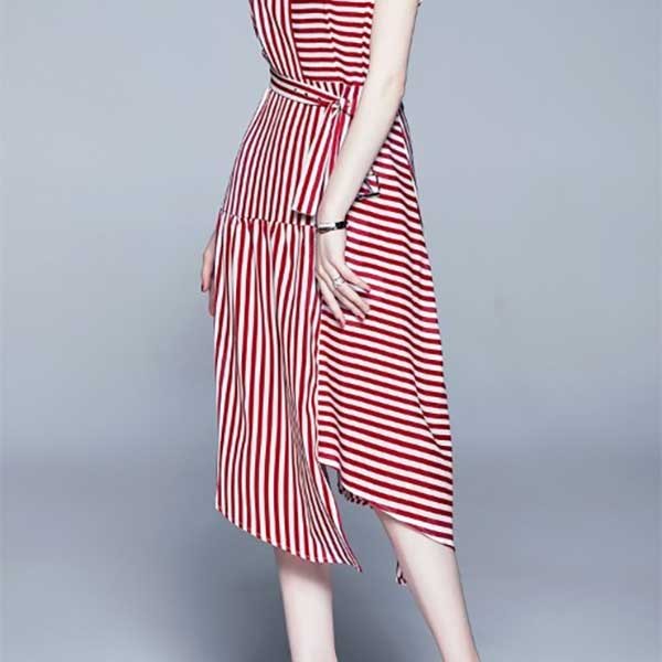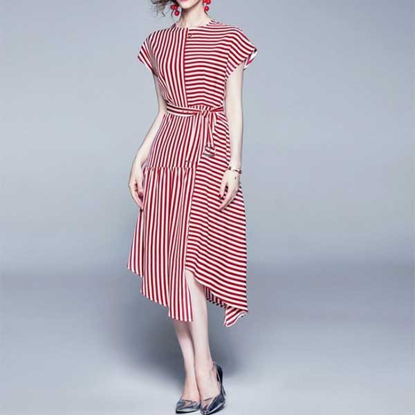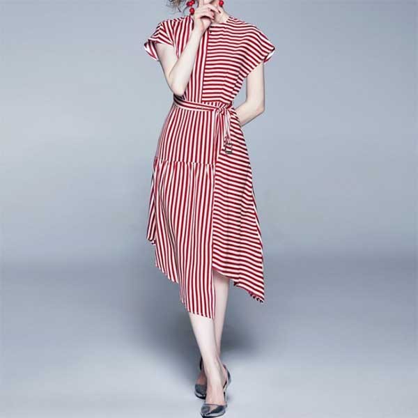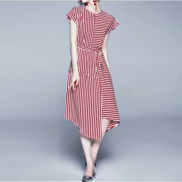 ワンピース パーティー 春 夏 お呼ばれ 結婚式 二次会 パーティ 袖付き ストライプ ボーダー 赤 膝丈 通勤 オフィス OL きれいめ 20代 30代 40代 50代 大きいサイズ