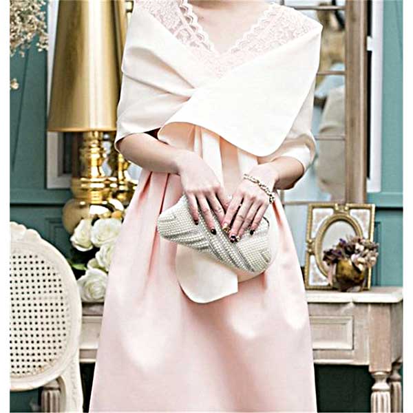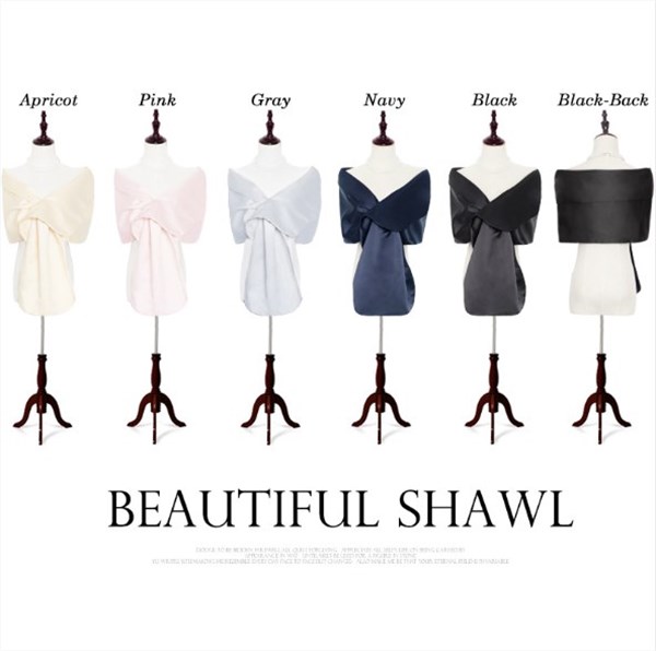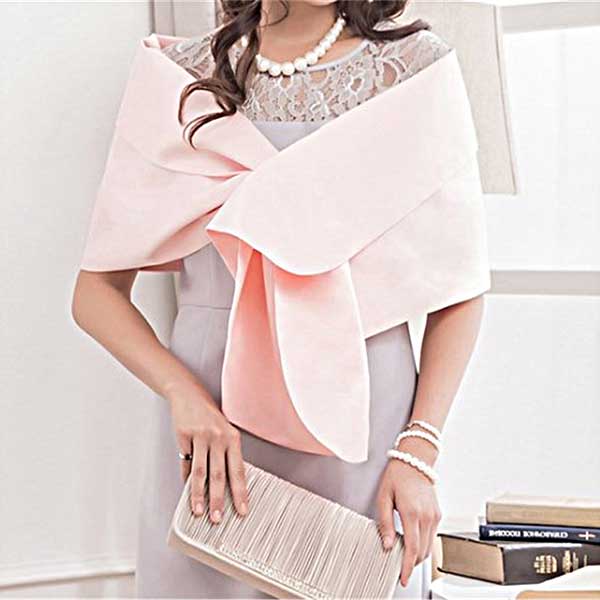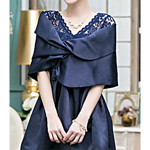 ショールのような羽織ったり、前で留めてボレロ風にとアレンジの効くサテンのショール。結婚式、パーティ、二次会などパーティワンピースの羽織りにお勧めです。