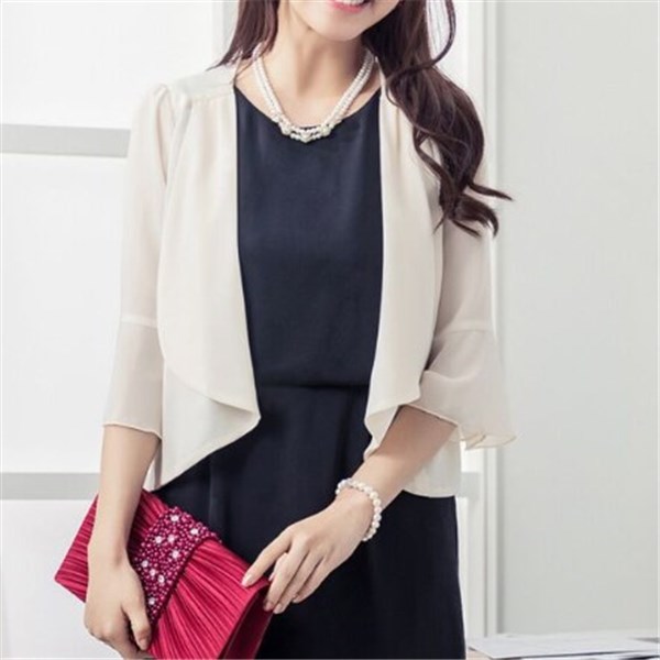 フリルが華やかなシフォンのボレロ、ショート丈ジャケット。結婚式、パーティ、二次会などパーティワンピースの羽織りにお勧めです。