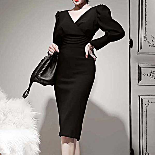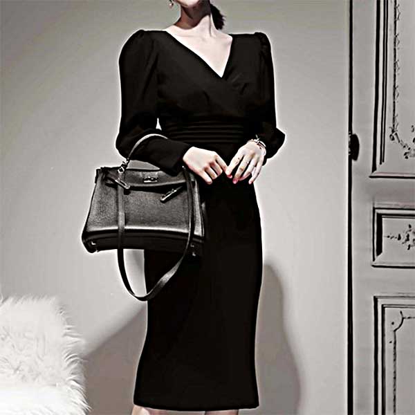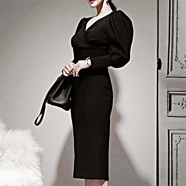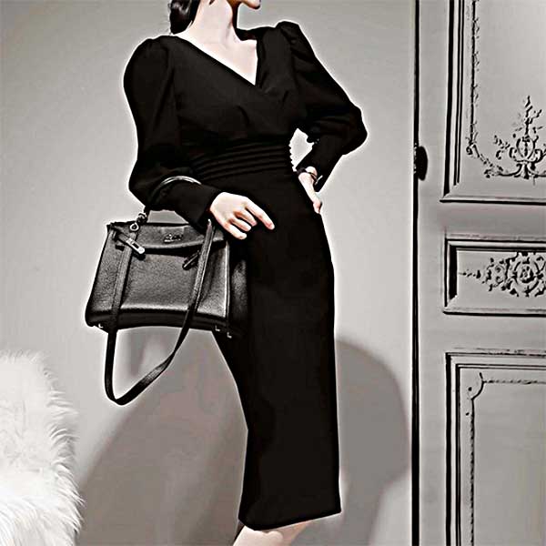 タイトなラインがのエレガントなワンピース。トレンドのボリューム袖です。・サイズ(単位cm):肩幅/バスト/ウエスト/ヒップ/袖丈/着丈・S:33/84/64/87/57/105・M:34/88/68/91/58/106・L:35/92/72/95/59/107
