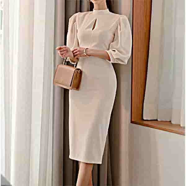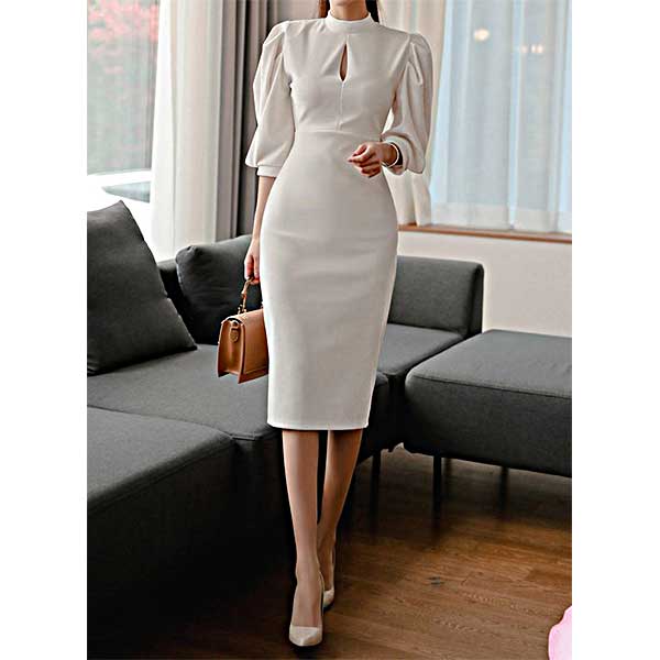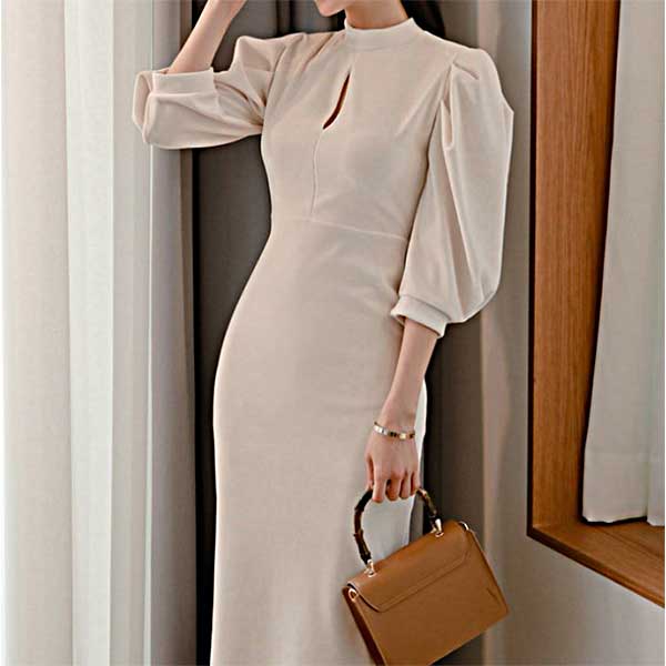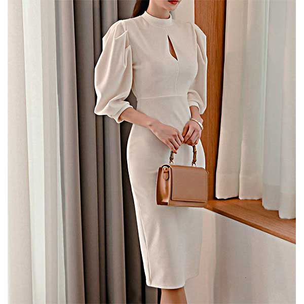上品な色香と清潔感あふれるワンピース。ボリューム袖が手元を美しく女性らしく見せてくれます。・サイズ(単位cm):バスト/ウエスト/ヒップ/袖丈/着丈・S:82/68/84/46/109・M:86/72/88/47/110・L:90/76/92/48/111・2L:94/80/96/49/112・素材:ポリエステル・ストレッチ性:なし