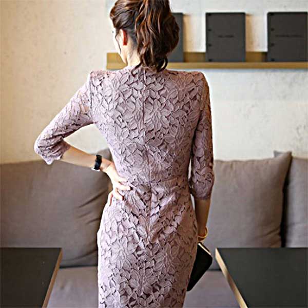 上品なくすみパープルの花柄レースワンピース・サイズ(単位cm):バスト/ウエスト/ヒップ/袖丈/着丈 ・S:82/66/84/40/103・M:86/70/88/41/104・L:90/74/92/42/105・2L:94/78/96/43/106・素材:ポリエステル