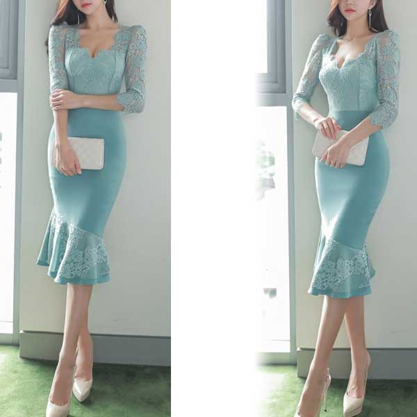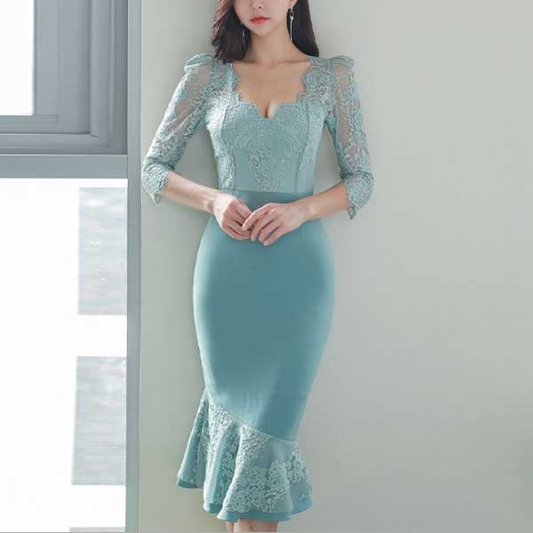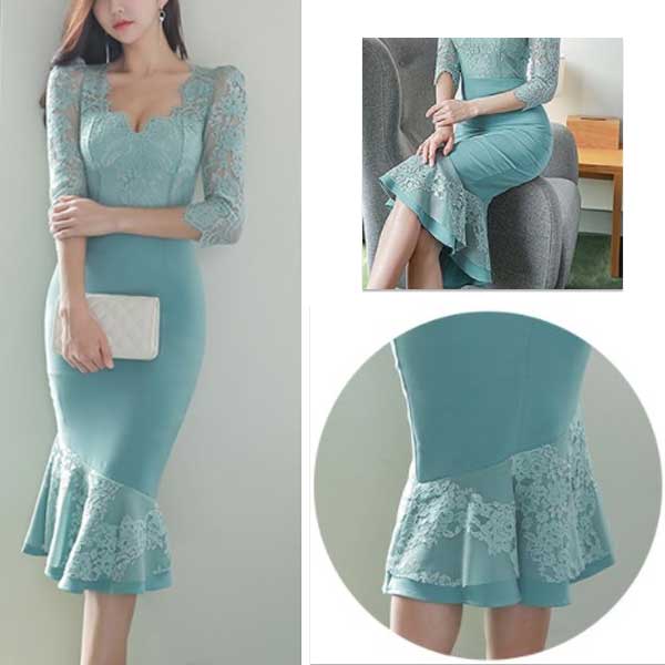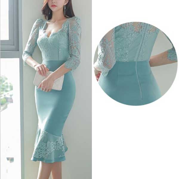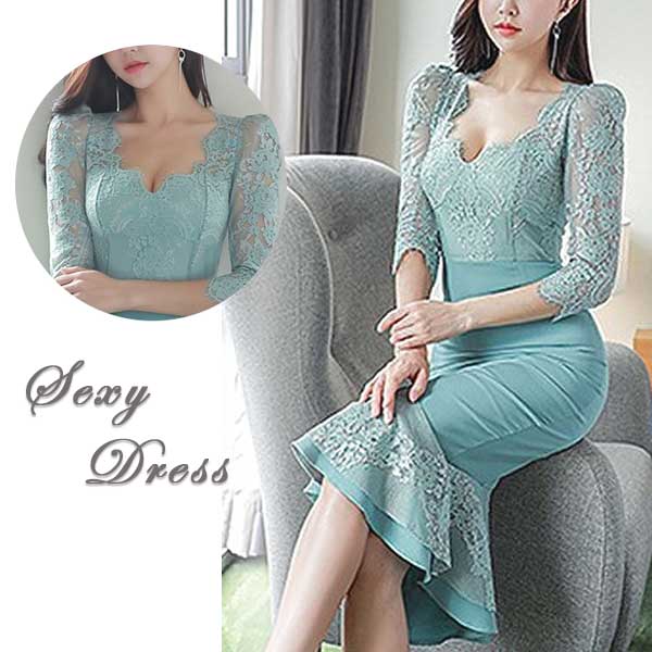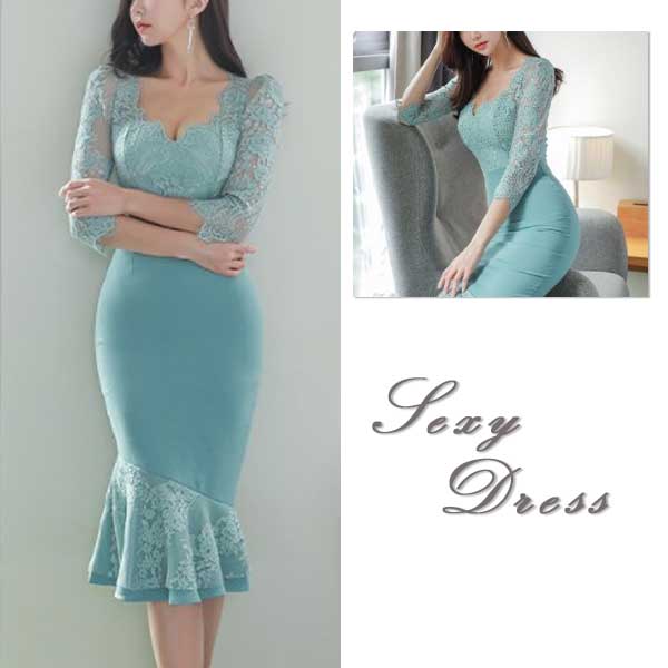 マーメイドのレース切替 7分袖 セクシーな綺麗系タイトワンピース【OH149】