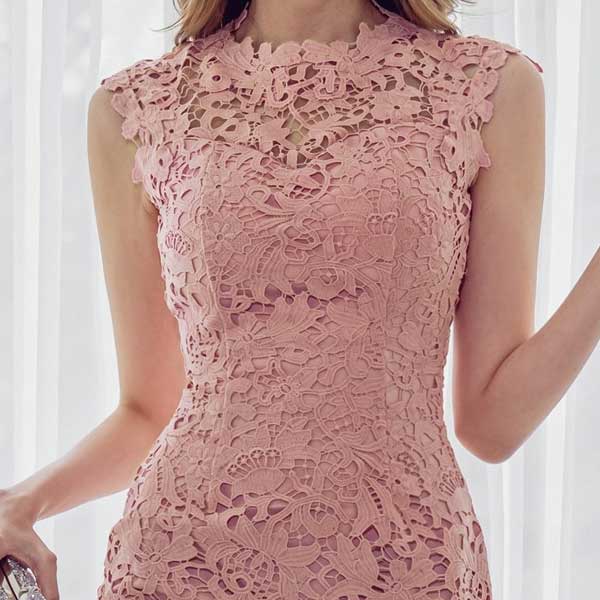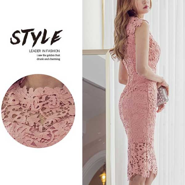 綺麗で可愛いピンクの総レース ノースリーブのタイトワンピース【OH151】