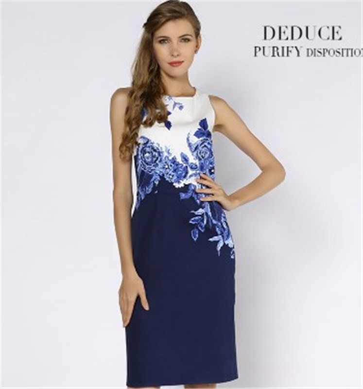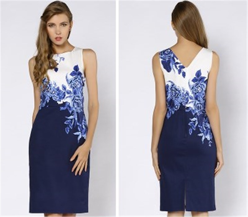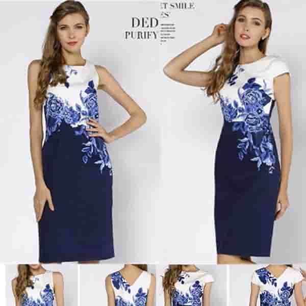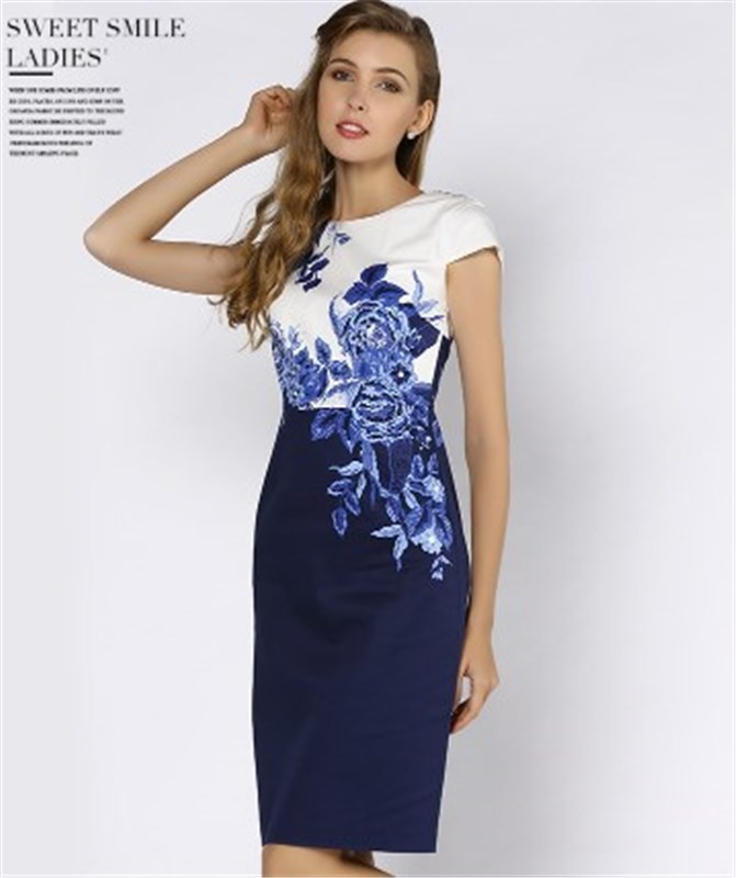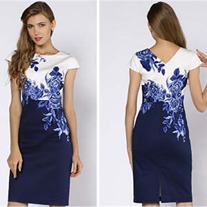 フラワー大柄 ブルーのタイトワンピース[OO71]